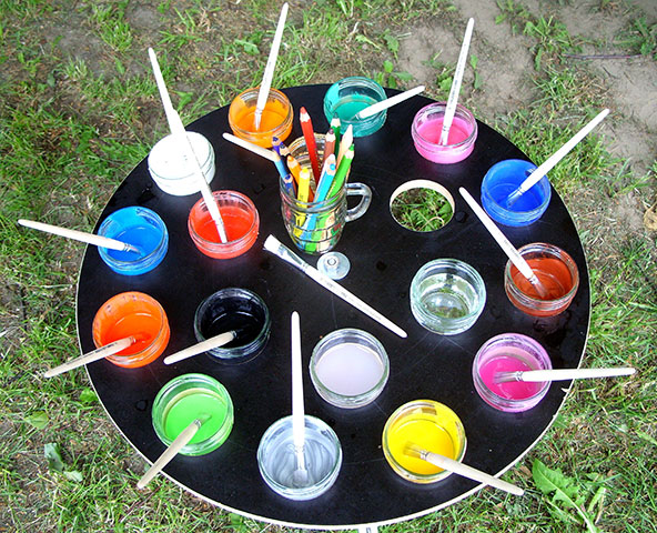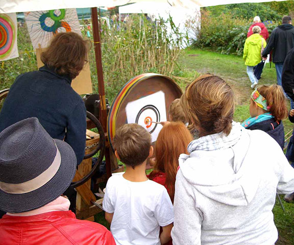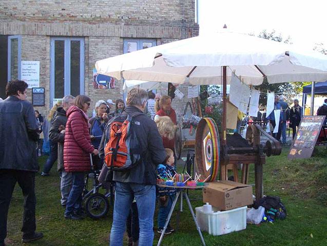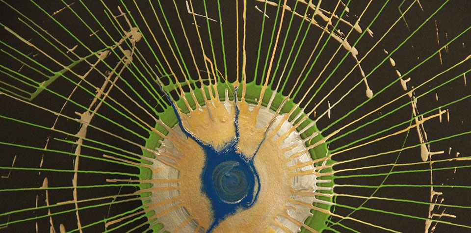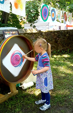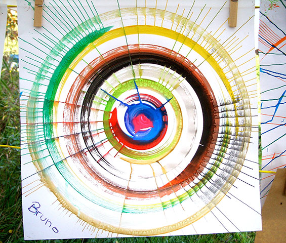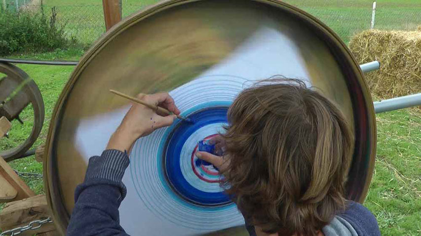 Konzentrierte Blicke sind auf die sich drehende Holzplatte gerichtet. Auf der anderen Seite wird gekurbelt. Was wir sehen verändert sich, solange es sich dreht. Blau, grün, gold, bronze, …wenn der Pinsel den rotierenden Karton berührt, entstehen Kreise, Farbverläufe… doch erst wenn die Kurbel aufhört und die Rotation verlangsamt, erkennt man mehr und mehr das entstandene Bild. Wie magisch erscheint, was die Fliehkraft mit der aufgetragenen Farbe gemacht hat: feine Strahlen, Farbspuren, expressive Grafiken und malerische Kreise.