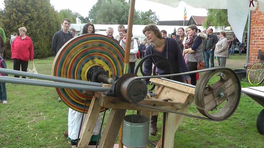 Die Malmaschine ist aus alten Fundstücken entstanden, die die Zeiten lange unbenutzt überdauert hatten. Die verlebte Kreissäge in unserem Stall bekam anstelle des Sägeblatts eine Holzplatte und zusätzlich eine alte Riemenmechanik. Die erste Rotations-Malmaschine hatte ihre Premiere unter einem Sonnenschirm auf der Wiese und lockte mit dem kreiselhaften Farbspiel viele Besucher an. Der Reiz zwischen Kontrolle des Pinsels und Zufall der Fliehkraft weckt bei Kindern und Erwachsenen den Künstler und erschafft individuelle Kunstwerke mit persönlichem Charakter.